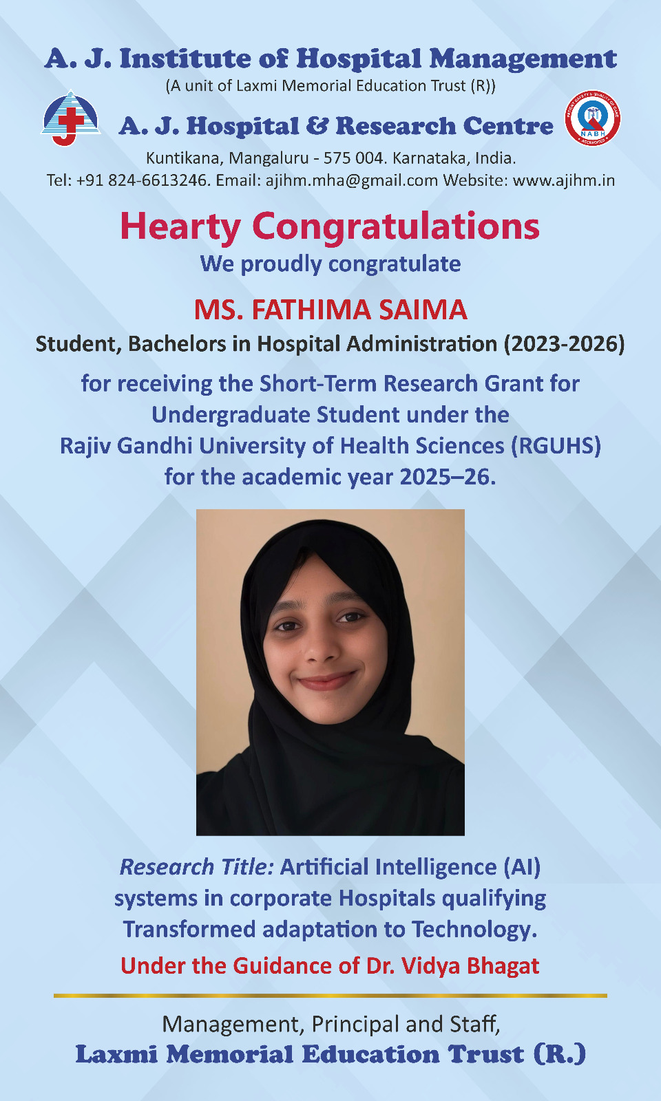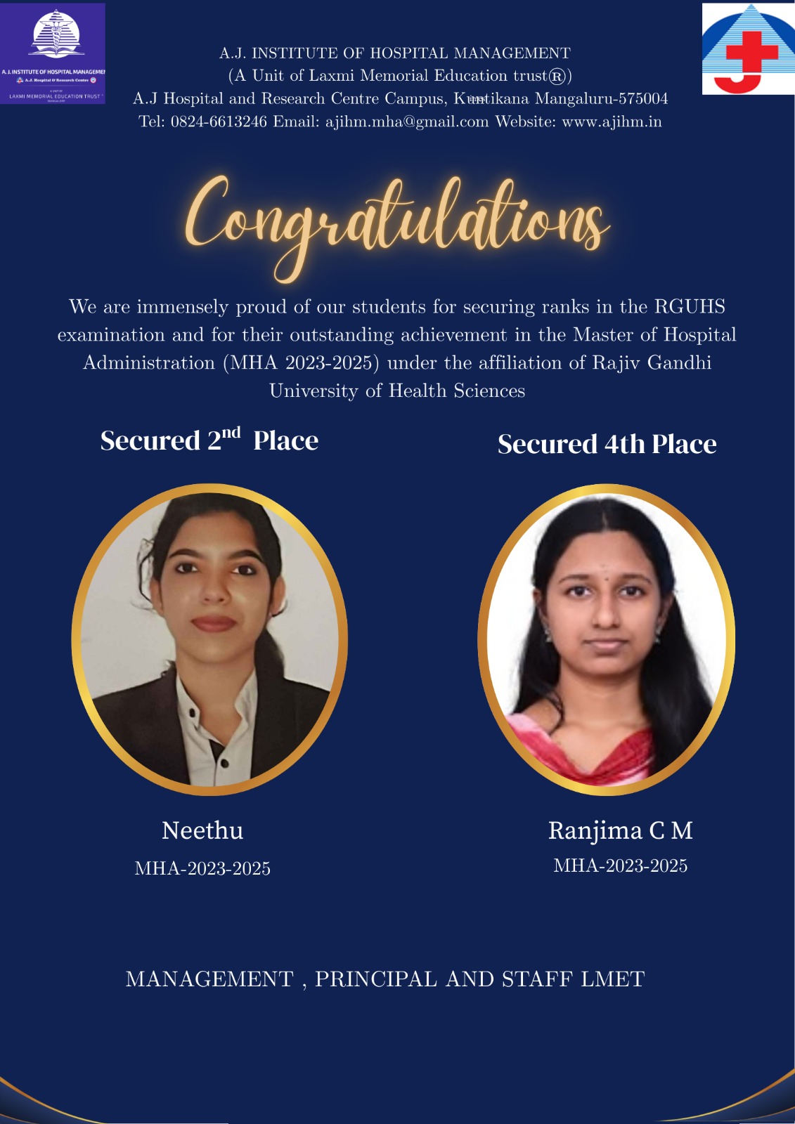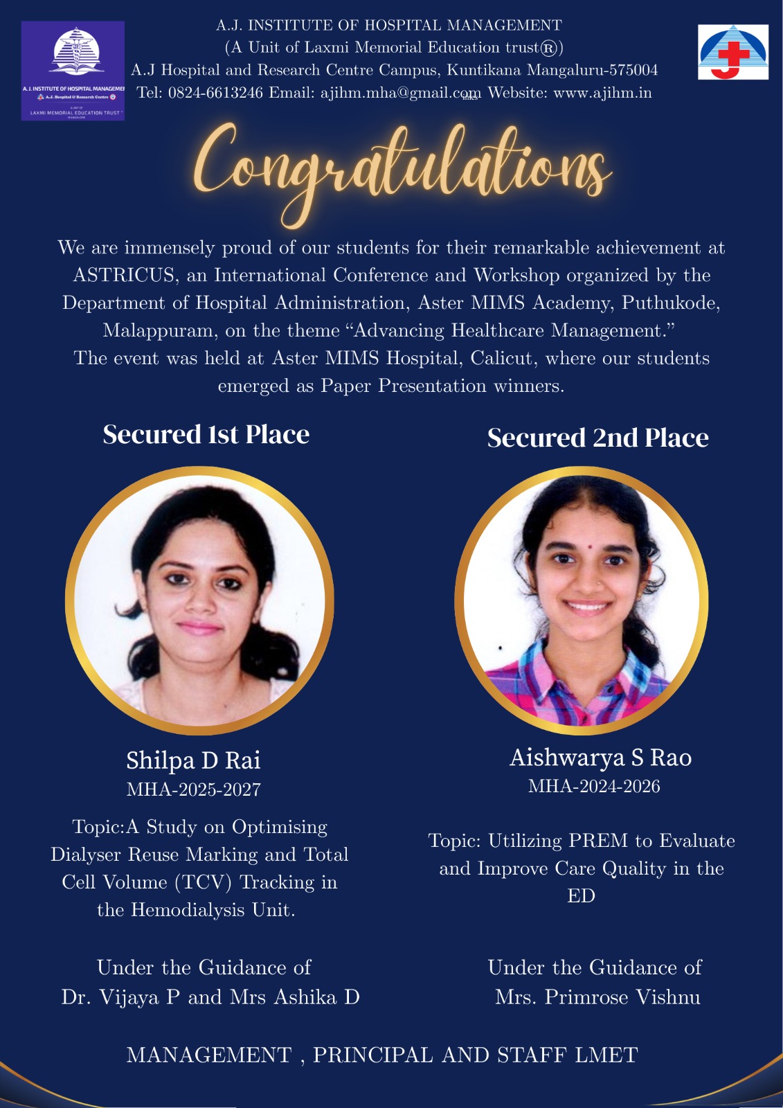 “A.J Institute of Hospital Management has provided holistic experience academically and practically. The facilities and faculties are wonderful and makes our MHA journey great.”